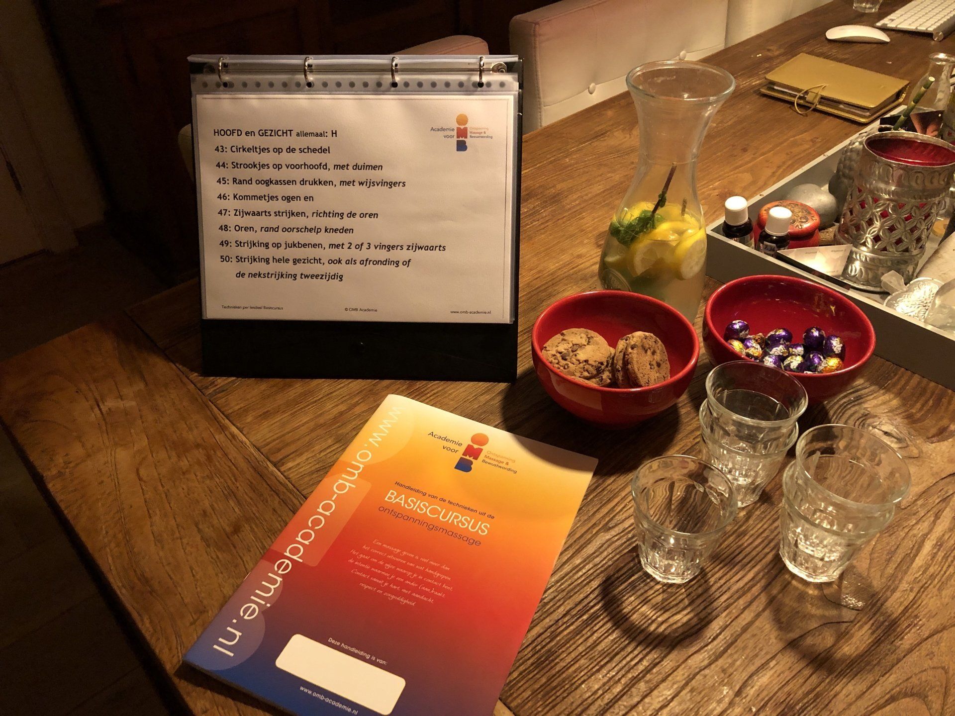 Op de achtergrond hoor je ontspanningsmuziek die zorgt voor een extra ontspannen sfeer. Daarnaast leren jullie wat er allemaal nodig is om een fijne zorgvuldige massage te geven, zoals de volgorde, tempo en druk van de technieken, je werkhouding, temperatuur, sfeer, soort olie, gebruik van massagetafel en doeken, maar ook informatie over de spieren en contra-indicaties.